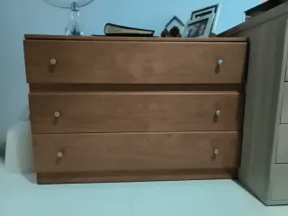 Mueble sinfonier de madera con un acabado en tono marrón cálido. Cuenta con tres cajones amplios. - Diseño clásico y funcional. - Tiradores redondos plateados.