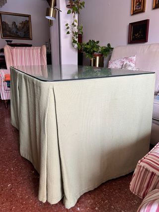 Mesa rectangular con cubierta de cristal y falda de tela. - Diseño moderno y elegante. - Ideal para complementar tu sala de estar. - Posibilidad de integrar un brasero.