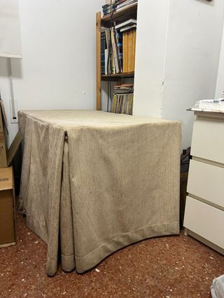 Mesa camilla rectangular de madera y paño beige.