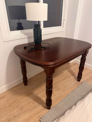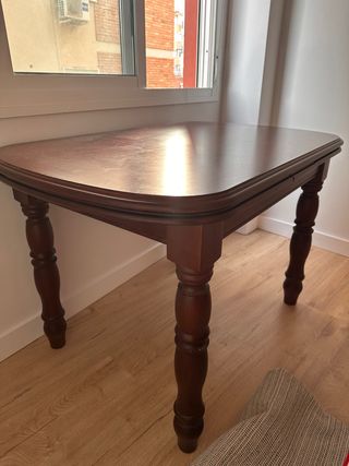 Vendo mesa de comedor de madera maciza en color nogal oscuro. Diseño clásico y elegante, muy robusta y estable. Es extensible, ideal tanto para el día a día como para reuniones o comidas con invitados. ✔️ Muy buen estado general ✔️ Patas torneadas de madera ✔️ Acabado brillante y bien cuidado ✔️ Fácil de combinar con cualquier estilo ✔️ Perfecta para comedor o cocina amplia Medidas aproximadas: – Cerrada: 120x 80cm – Abierta: 200x 80 cm