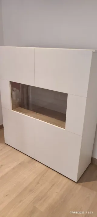 Mueble de almacenamiento con estantes y puertas de cristal. - Estructura principal en madera. - Puertas con paneles de cristal. se pueden comprar por separado o en conjunto, seria 50€ la estantería y 70 la vitrina, las dos cosas serian 110€