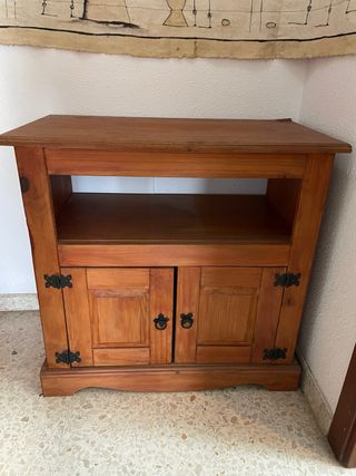 Mueble de estilo rústico. Tiene algunos desperfectos. Medidas: 43,5x70 cms. - Acabado en madera natural. - Puertas con herrajes decorativos. - Compartimento abierto superior.