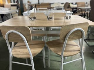 Conjunto de mesa de comedor con cuatro sillas a juego, todo completamente nuevo. - Diseño moderno y funcional. - Acabado en madera clara. - Patas metálicas blancas.