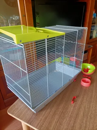 Medidas 24×50×40 Jaulas para roedores pequeños En la última foto se ve a mí hamster (garbancito se llamaba) . Un hámster sirio o más gordito, opino que es demasiado grande para este tipo de jaula La jaula ha sido usada por varios animales, tiene desperfectos en las esquinas pero ha sido y fue lavada y cuidada durante mucho tiempo y con mucho esfuerzo Tiene varias plataformas con sus respectivas escaleras e incluye más plataformas por si quisiera hacer combinaciones + los enganches para la jaula y las plataformas Tiene 2 platos de comida y dos iglús Contiene enganche para botella de agua que no está incluida y no tiene rueda (la