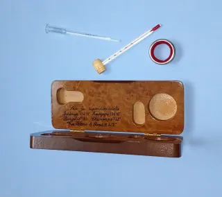 Elegante set de accesorios para amantes del vino, presentado en una caja fabricada en madera maciza de gran calidad color cerezo. Tiene grabado en la tapa "Les Bons Vins de France", traducido "Los buenos vinos de Francia" y, en el interior, "Pour la dégustation idéale..." Para la degustación ideal, con la temperatura idónea para la cata y el disfrute de diferentes vinos, como Champán, Borgoña, Burdeos, Beaujolais, Blancos y Rosados. Es un detalle perfecto para regalar. En perfecto estado.