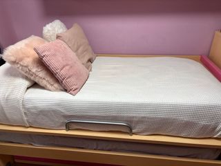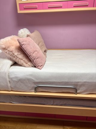 Cama nido doble con espacio de almacenamiento. - Estructura de madera. - Cajones integrados para guardar objetos. - Acabado en color rosa y marrón.