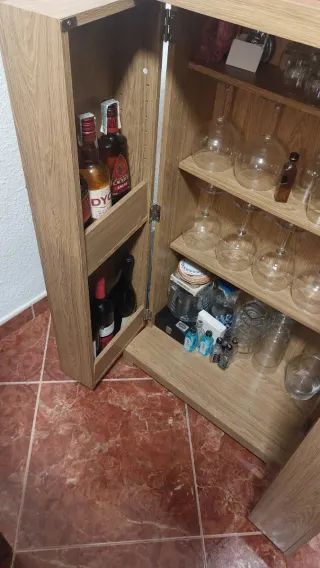 Mueble versátil para organizar tu colección de vinos, licores y copas. - Diseño elegante con acabado en madera. - Estantes interiores para almacenamiento. - Ideal para bodegas o barras de bar.