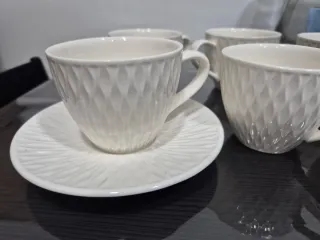 Elegante juego de seis tazas de porcelana con sus respectivos platos, solo 3. - Diseño texturizado. - Color blanco. - Material de porcelana.