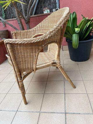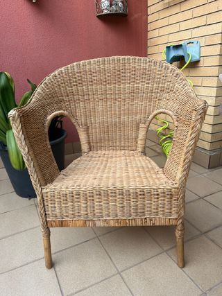 Acogedora silla de mimbre, perfecta para tu jardín o terraza. Su diseño natural aporta calidez a cualquier espacio exterior. - Estructura de mimbre y madera. - Tonos beige y marrón.