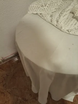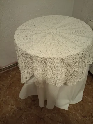 Mesa redonda con mantel tejido, crochet y debajo ,