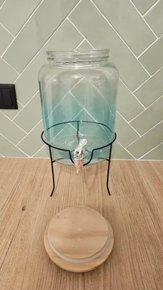 Dispensador de agua de gran capacidad con un diseño elegante. - Capacidad de 8 litros. - Fabricado en vidrio transparente con detalles en verde azulado. - Tapa de madera. - Grifo metálico. - Incluye soporte metálico negro.