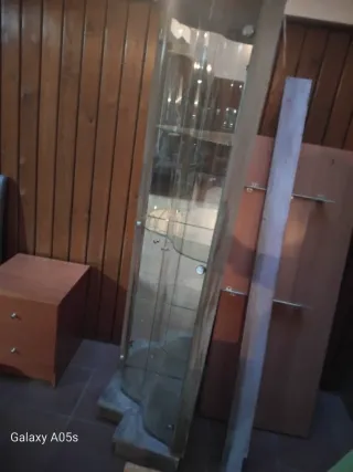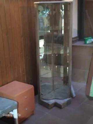 Vitrina esquinera con un diseño elegante que combina cristal y madera. - Estructura principal de madera. - Puertas y estantes de cristal.