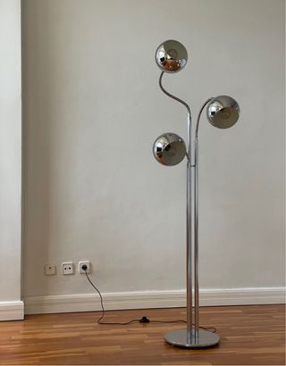 Lámpara de pie eyeballs cromada Estiluz años 70. 3 tulipas articuladas que la hacen muy versátil y funcional, pudiendo dirigir cada tulipa hacia un punto distinto. Medidas: 32 cm diámetro base x 180 alto. Gran estado de conservación, funciona perfectamente. Cableado revisado y sustituido el interruptor de pie por uno nuevo. Posibilidad de entrega a domicilio zona Maresme,Girona y Barcelona. _____________________________ Fase tramo estiluz eyeball flos cassina metalarte sauce mid century bauhaus space age vintage usm haller maga airbome artemide design m114 diseño modular aparador lampara seta codialpo arco 520 president