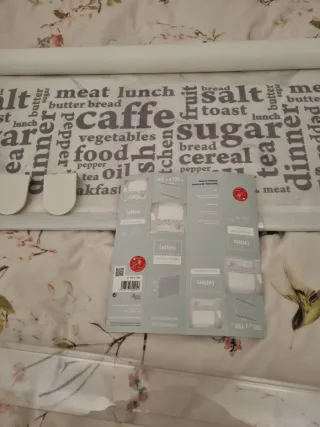 Estor con un diseño moderno y elegante, perfecto para cualquier cocina. Añade un toque de estilo y funcionalidad a tu espacio. - Diseño con texto y motivos de alimentos. - Mecanismo de subida y bajada. Nunca usado. Como se ve en la foto se intentó colgarlo con no más clavos y han quedado así las piezas, pero siguen siendo útiles también con tornillos (no incluíos) tiene instrucciones.