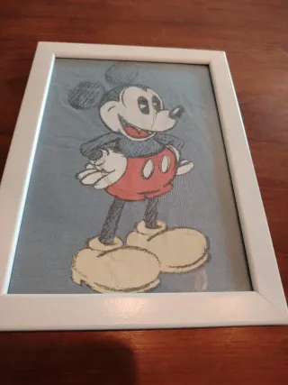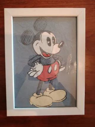 Marco decorativo con un dibujo de Mickey Mouse sobre tela. Ideal para los fans del ratón más famoso. - Dibujo de Mickey Mouse. - Marco blanco. 25 x 34 x 1.5 cm
