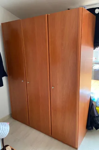 Armario de madera con tres puertas y dos cajones interiores. - Amplio espacio de almacenamiento. - Diseño clásico y funcional.