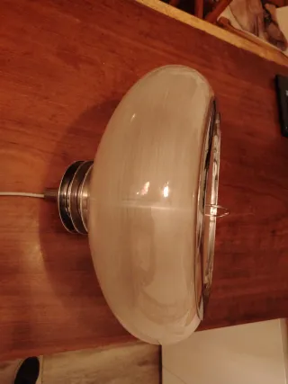 Lámpara con un diseño moderno y elegante. - Pantalla de cristal esmerilado. - Base de metal pulido. - Acabado en color blanco y plateado. 50 x 45 (diamètre)