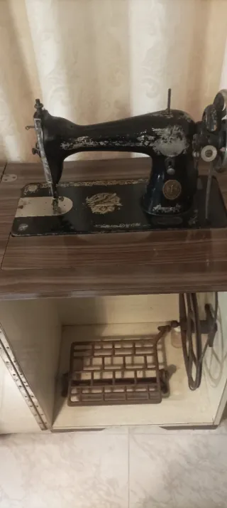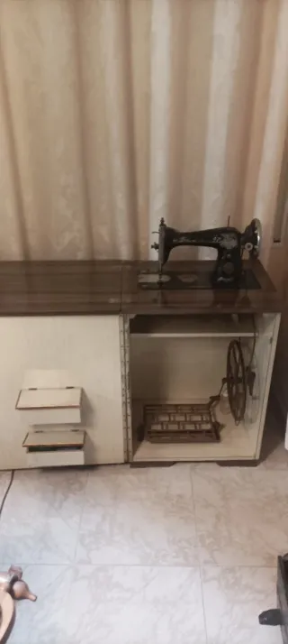 Máquina de coser antigua con su mueble plegable. - Diseño clásico. - Mueble con superficie de madera. - Compartimento abierto con rueda. - Cajones frontales.