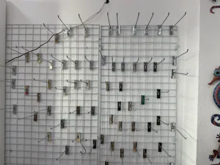 Estantería de pared con múltiples ganchos y pinzas. - Ideal para organizar y exhibir productos. - Estructura de rejilla resistente. - Ganchos de metal plateado. - Pinzas de sujeción.