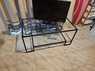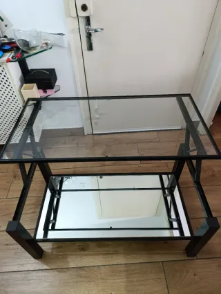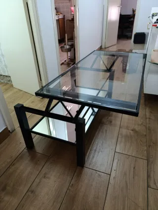 Elegante mesa de centro con un diseño moderno y funcional. - Tablero de cristal transparente. - Estructura metálica en color negro. - Balda inferior con acabado espejo. - espejo inferior se desmonta y también el cristal superior . (Posibilidad de transporte, precio según km a recorrer. )