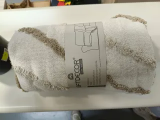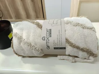 Manta de la marca Giftdecor, perfecta para usar como cubresofá o cubrecama. - Medidas: 150 x 220 cm. - Diseño con textura y flecos. Me encuentro en Alicante, puedo hacer entregas a domicilio.