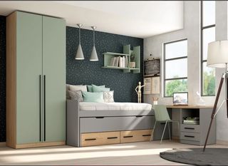 Dormitorio juvenil con un amplio espacio de almacenamiento. Podrás mantener el orden todo el tiempo que quieras. La cama compacta de 90×190 cm cuenta con dos cajones inferiores ideales para guardar las mantas en invierno.Somieres (2) necesarios en la cama,50€ unidad Acompañada de un armario de dos puertas con una cajonera interior, toda la ropa tendrá su propio sitio. Guarda todo el calzado en el zapatero extraíble , y disfruta de tus hobbies en el escritorio que completa esta composición de dormitorio. Añade un toque de personalidad añadiendo tu decoración favorita en la estantería. Envío y montaje opcional 155€(hasta 15 km).