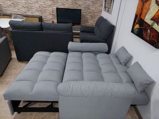 Sofá cama de tela en tono gris oscuro, de 230 cm. Con Chaise longue y arcón debajo del mismo, para guardar mantas, etc... Se convierte en cama muy fácilmente. La medida de la cama es aproximadamente de 132x190 cm