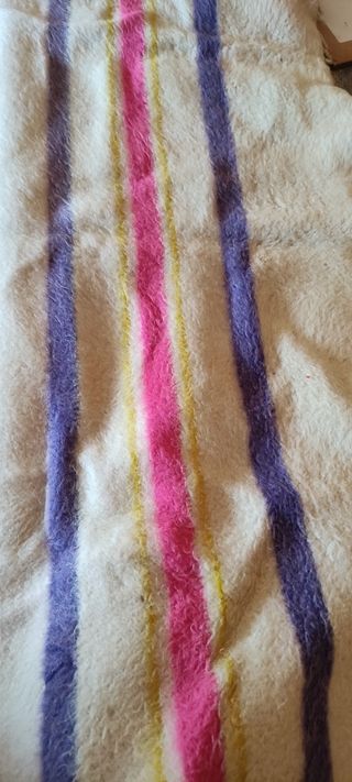 Preciosa manta de lana, perfecta para abrigarse en el sofá o en la cama. Es un cobertor antiguo, por lo que es de pura lana virgen. Es de color blanco con rayas multicolores. - Suave y cálida. Ideal para cualquier época del año. Preguntar por el precio sin compromiso.