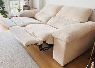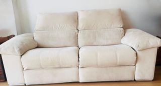 Sofá de tres plazas con función eléctrica. Disponible para envío el 14 de Abril. - Tapicería de tela antimanchas lavable a máquina. Se desmonta fácilmente por módulos. - Color beige. - Buen estado. - Ambos reposabrazos disponen de un espacio para guardar mantas u otros objetos. El fondo con el asiento extendido incluyendo medida del respaldo es de aproximadamente: 154 cm Sin el asiento extendido incluido medida del respaldo es de aproximadamente: 116 cm