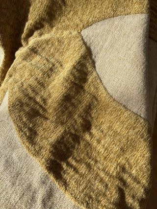 Manta de sofá con un diseño geométrico en tonos beige y dorado. Aporta un toque acogedor a tu salón. - Diseño con formas orgánicas. - Tacto suave y agradable.