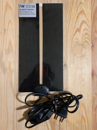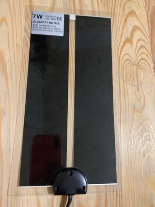 Placa calefactora para terrarios de reptiles. Incluye cable de alimentación y regulación de temperatura. Manta termica, resistencia calefactora. - Potencia: 7W - Medidas: 15x28cm - Voltaje: 220-240V - Indicaciones de seguridad: no doblar, no perforar, no sumergir.