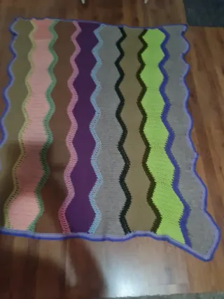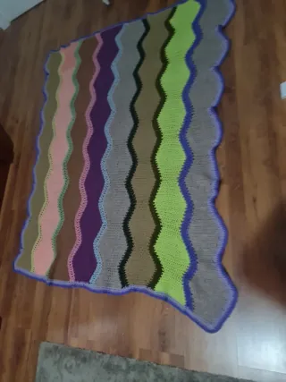 Manta tejida a mano con un diseño ondulado y vibrante. Perfecta para añadir un toque de color a cualquier espacio. - Medidas 179x140 - Diseño de rayas onduladas. - Bordes festoneados. - Textura suave y acogedora.