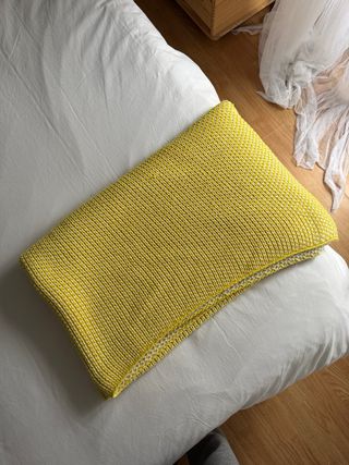 Manta de Zara Home con un diseño tejido en tonos amarillos y blancos. Aporta un toque de color y calidez a tu hogar. - Textura agradable al tacto. - Diseño reversible. tiene unos pequeños enganchones por la zona amarilla mide 1.40x1.50
