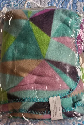 Manta pequeña con un diseño geométrico vibrante, ideal para añadir un toque de color a tu sofá. Está confeccionada en un material suave y acogedor. - Diseño de triángulos en varios tonos. - Acabado con ribete y costura decorativa en color turquesa.