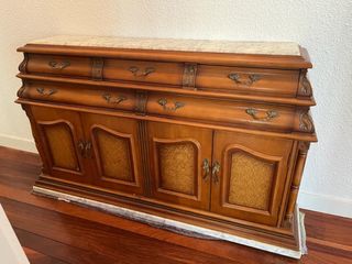 Mueble precioso en madera y mármol. Estado impecable, tanto en la madera tallada como en los herrajes y tiradores. Tiene de fondo 30 cm en su base y 22,5 cm en la parte superior, ya que tal como se observa en la fotografía es más estrecho en la parte superior. Lo tenemos con una manta para poder moverlo, por eso se aprecia una especie de tela gris en contacto con el suelo, eso después desaparece. Si no te interesan los espejos se podría negociar sin ellos sin problema. Puedes verlo sin ningún compromiso para ver sí te encaja !! 👍