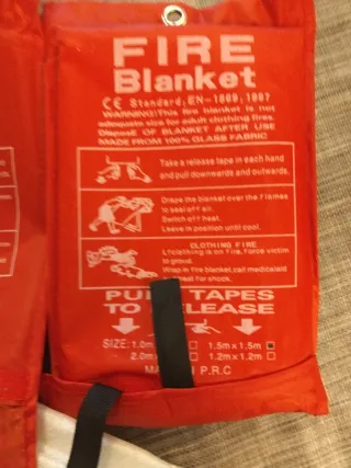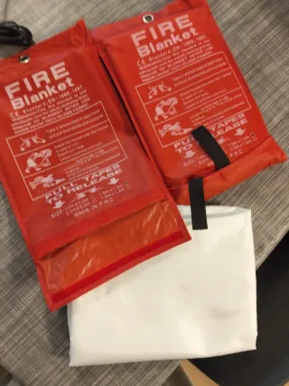 Se venden dos mantas ignífugas de 1.5m x 1.5m, ideales para pequeños incidentes comúnmente utilizada en cocinas . Material: Está fabricada con 100% fibra de vidrio resistente a altas temperaturas. Funcionamiento: Funciona sofocando el fuego al cortar el suministro de oxígeno. Seguridad: Cumple con la norma europea EN 1869:1997 para la seguridad contra incendios. Uso: Se despliega tirando de las cintas hacia abajo y cubriendo el fuego por completo. *Envío rápido ,ver fotos .*
