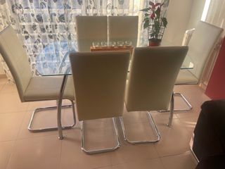 Conjunto de mesa de salón con seis sillas. - Mesa con superficie de cristal. - Sillas con estructura cromada.