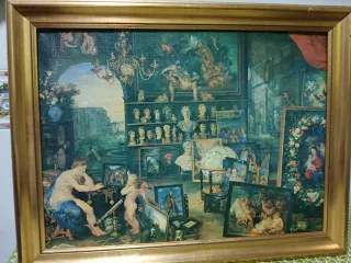 Conjunto de dos cuadros. Réplicas en lienzo. Medidas: El marcó 53 x 41 cm Lienzo 47 x 34 cm Uno es la pintura al óleo titulada "La Vista", creada por Jan Brueghel el Viejo y Peter Paul Rubens alrededor de 1617. El otro es La Danza de aldeanos de 1635 es un cuadro de Rubens,Año, 1635.