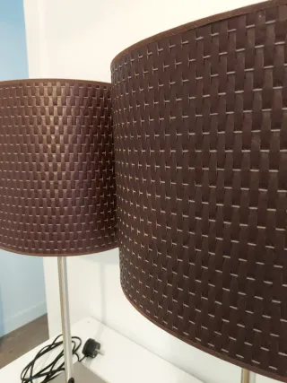 Conjunto de dos lámparas de mesa de Ikea. Tienen dos pequeños desperfectos en las pantallas (dos últimas fotos) que he pintado en marrón y casi no se aprecian. Las bases son regulables en altura, aunque una de ellas tiene la mariposa trasroscada y no funciona bien, habría que cambiársela por otra o un tornillo. - Su precio es 15 por unidad. Las dos 25. - Base y pie de metal plateado. - Pantallas de tela marrón con textura tejida.