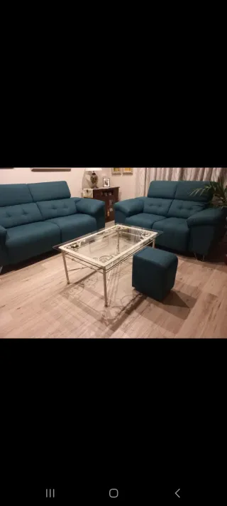 ¡SOLO VENTA EN PERSONA! Sofa 3 plazas relax electrico con 2 motores 2.20mx1.80m Sofa fijo 2 plazas 1.80mx1m Brazos de 30cm con 4 arcones y 4 puff en los extremos. Pata acero de 12cm. Tapizado serie A. Seminuevos y bien cuidados. Color azul verdoso. Se venden por problema de espacio.