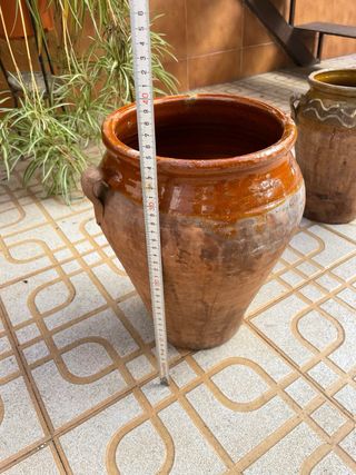 Bonita vasija de barro con un diseño rústico y tradicional. Perfecta para decorar o para uso decorativo. - Acabado brillante en la parte superior. - Dos asas laterales. - Textura natural del barro. - Alto 35 cm - Boca 20 cm