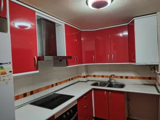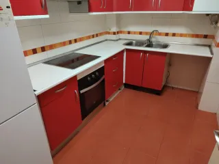 Conjunto de muebles de cocina en llamativos colores rojo y blanco. - Diseño moderno y funcional. - Combinación de materiales de madera y metal.