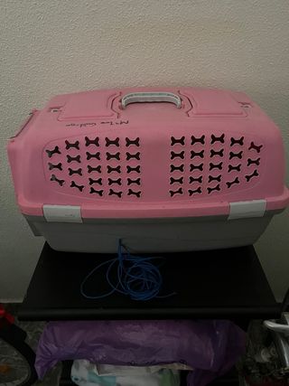 Transportín para mascotas con un diseño práctico y seguro. Ideal para viajes o visitas al veterinario. - Parte superior de color rosa. - Base de color gris. - Rejillas de ventilación con forma de hueso. Grande 0’75 largo