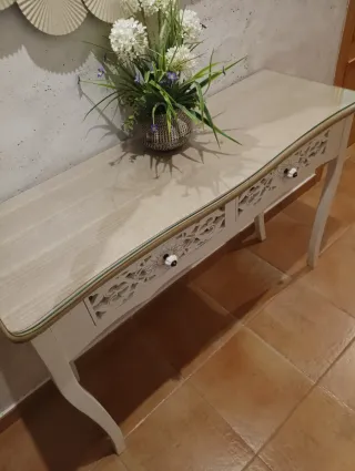 Elegante entradita con un diseño delicado y acabados cuidados. - Encimera de madera con tapa de cristal. - Patas curvas con un toque clásico. - Cajones con detalles ornamentales calados.