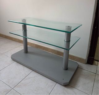 Mesa auxiliar con dos estantes de cristal y estructura de metal. - Base gris. - Estantes de cristal transparente.