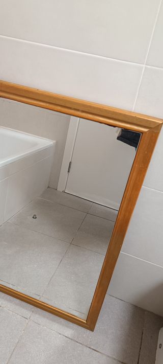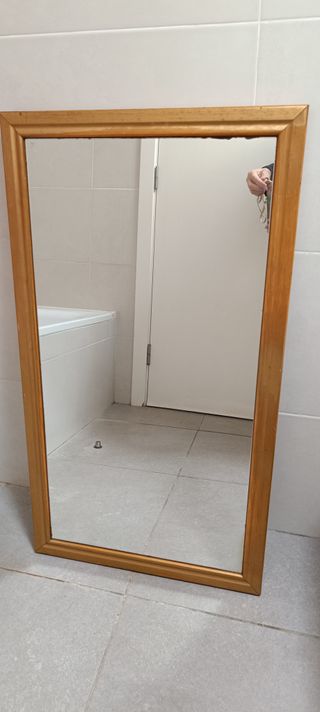 Elegante espejo de pared con marco de madera. - Medidas medianas. - Acabado dorado en el marco. A recojer en Es Mercadal o en Mahon