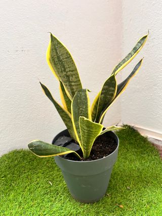 Planta de interior Sansevieria, también conocida como lengua de suegra, en maceta. - Hojas verdes con bordes amarillos. - Maceta de plástico gris. Conjunto de todas las plantas con sus macetas 10 unidades Por unidad 5 cada una Grande 7