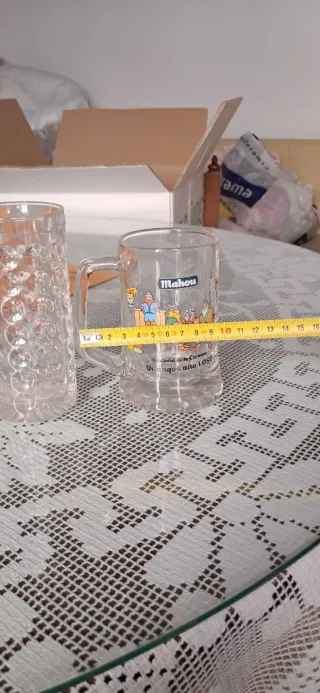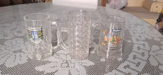Set de tres jarras de cerveza de cristal con diferentes diseños. - Jarra con escudo Bellburger Diltener. - Jarra con relieve de burbujas. - Jarra con logo Mahou y escena.