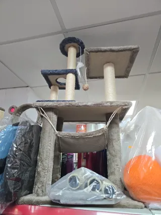 Estructura de varios niveles para gatos, ideal para jugar y descansar. - Cubierta de felpa suave. - Postes rascadores de sisal. - Hamaca para relajarse. - Juguetes colgantes para entretener.