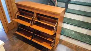 Mueble zapatero de diseño moderno y funcional. Ideal para organizar tu calzado. - Fabricado en madera. - Color marrón. - Dispone de varios compartimentos para zapatos. medidas: 96cm ancho x 85 de alto x 27 de profundidad. Tiene algún desperfectos por el uso, en la última foto se ven un par de desperfectos.